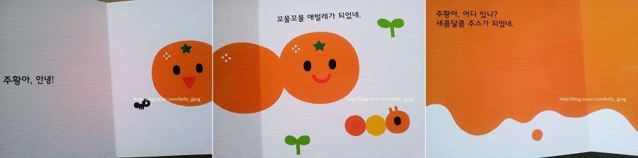 첫 장을 펼치면 나오는 귀여운 귤 모양의 주황이와 '안녕'하고 인사해 보아요^^