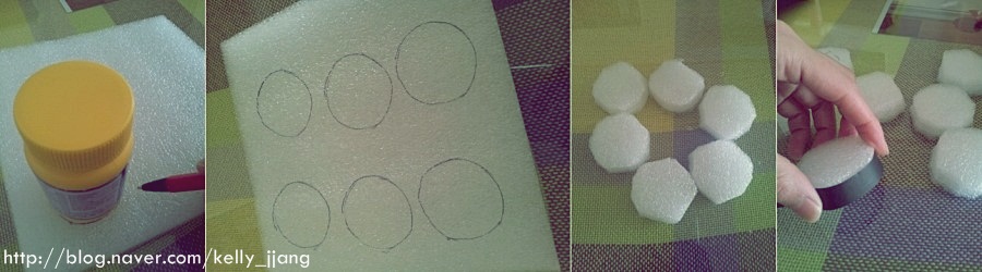 1. 스티로폼에 동그라미 모양을 그리고 자른 후에 검정색 색종이로 감싸요.