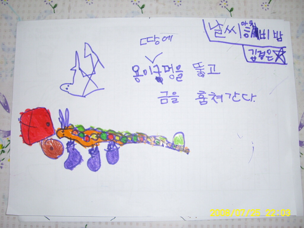 뒷이야기를 상상해보기를 다음으로 이 이야기로 얻은 교훈은 뭘까?하고 물었던니 두경이는 아주 현명한 이야기고 부정적인 생각을 하지 말아야 한다고 했다. 이 질문을 하고 났어 바로 후회를 했다. 재미있었지라고 끝내야 하는데...어휴 나도 참!
