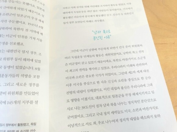 우리나라가 남과 북으로 분단된 이유도 명확하게 설명하고 있어서 청소년들이 역사를 바로 이해하는데 도움이 되고 있습니다. 또한 인물소개도 각주로 소개하고 있어서 관심사를 확장할 수도 있습니다.