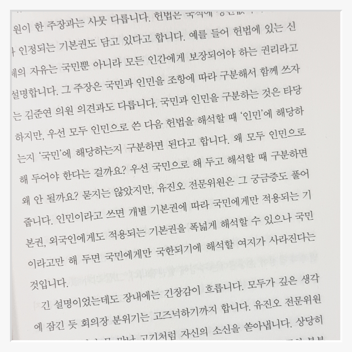 책을 읽다 보면, 당시 제헌의원들이 단순히 법을 만드는 것이 아니라, 사회적 문제를 해결하고 더 나은 미래를 꿈꾸며 헌법 조항을 마련했다는 것을 알 수 있다. 예를 들어, 국호를 '대한민국'으로 결정한 이유나, 기본권 주체를 '국민'으로 할지 '인민'으로 할지에 대한 논쟁 등은 그들의 고민과 결단을 잘 보여준다. 이 과정에서 그들이 얼마나 치열하게 토론했는지를 생생하게 느낄 수 있었다.