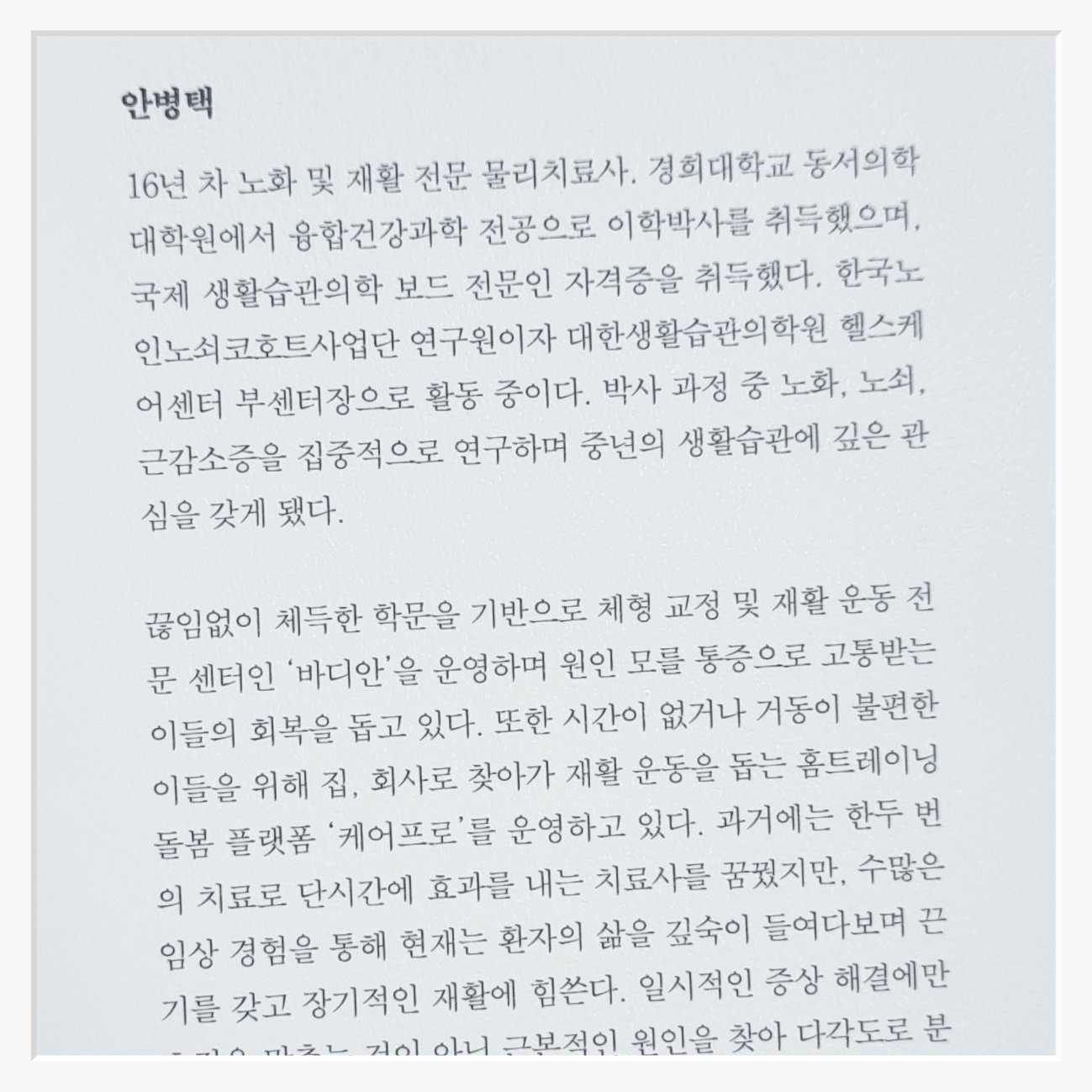 사실 나는 그동안 운동을 꾸준히 하지 못하고, 스트레스를 제대로 관리하지 못해 고민이 많았다. 마치 내 얘기를 하는 것 같아 흥미롭게 읽기 시작했는데, 이 책은 단순한 건강 정보서가 아니었다. 실제로 따라 할 수 있는 구체적인 방법들을 제시해주어 더 흥미로웠다.