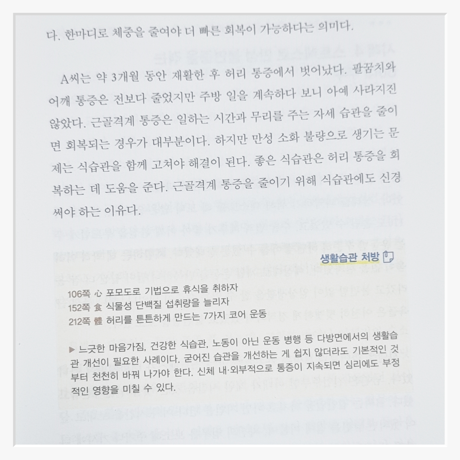운동습관 부분에서는 바른 자세 유지와 유산소 운동, 근력 강화 등 신체 활동을 통해 건강을 유지하는 방법을 소개한다. 특히 7가지 나쁜 자세를 피하고 바른 자세를 유지하는 법이 큰 도움이 되었다. 이 방법을 실천하면서 허리 통증이 줄어드는 것을 느낄 수 있었다.