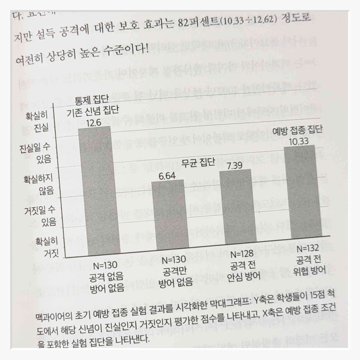 저자는 가짜 뉴스에 대한 면역력을 키우기 위한 다양한 방법을 제안한다. 그 중 하나가 가짜 뉴스의 유형을 미리 학습하는 것이다. 우리가 가짜 뉴스에 익숙해지면, 이를 쉽게 구분하고 걸러낼 수 있게 된다는 것이다. 이 부분에서 나는 백신 접종과 비슷한 원리라는 생각이 들어 매우 흥미로웠다.
