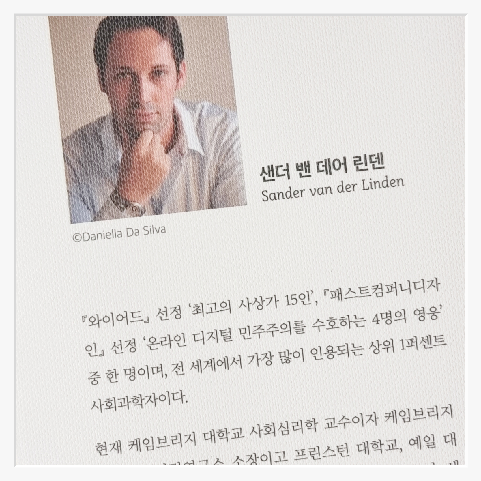 이 책의 저자인 샌더 밴 데어 린덴은 심리학자로, 가짜 뉴스와 잘못된 정보의 전파 메커니즘을 분석하고, 이에 대응하는 방법을 제시한다. 특히 흥미로웠던 점은 저자가 가짜 뉴스를 바이러스에 비유한 것이다. 가짜 뉴스도 바이러스처럼 퍼지고, 이를 막기 위해서는 '심리적 백신'이 필요하다는 것이다.