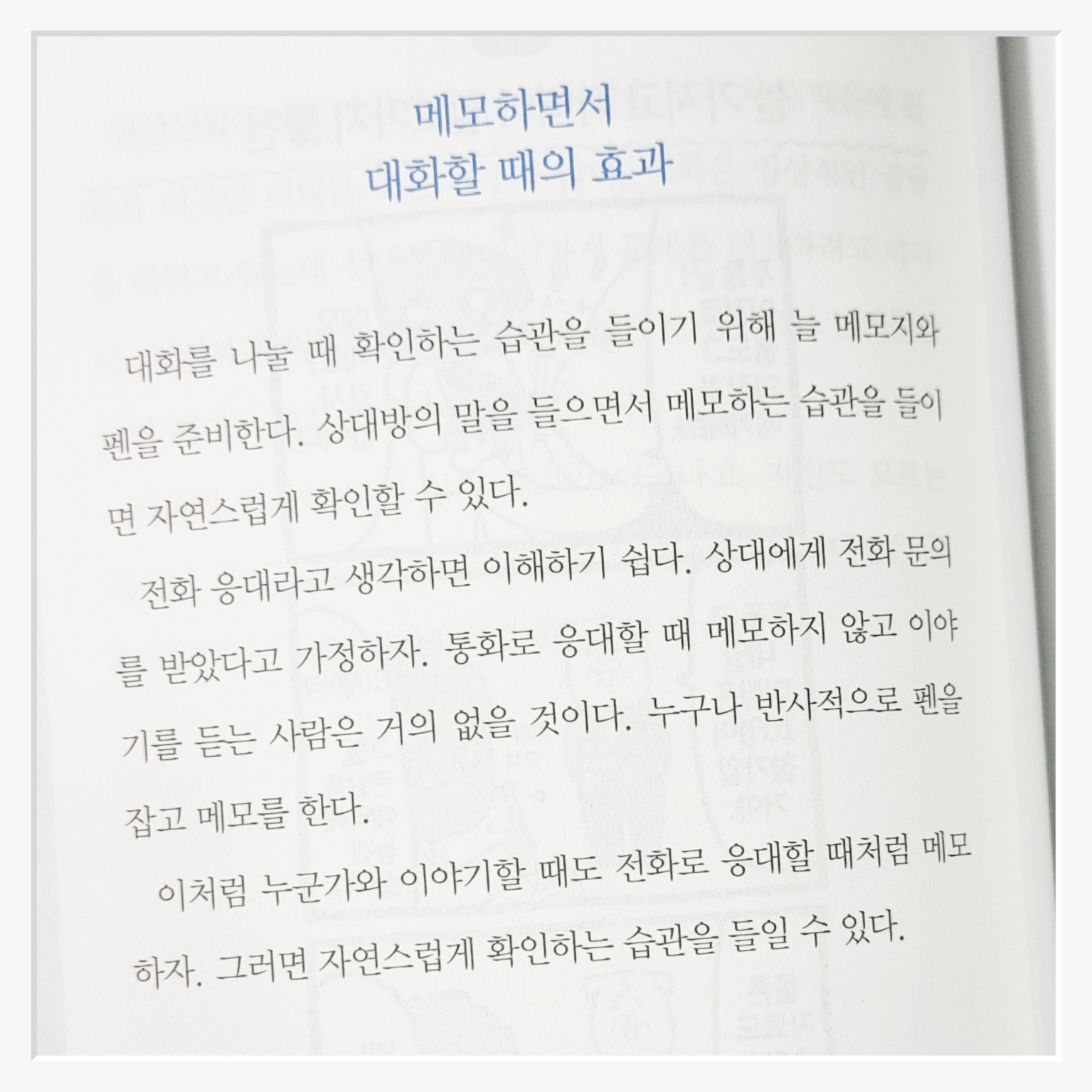 또한이 책은 대화의 흐름을 자연스럽게 이끌어가는 질문의 기술도 다룬다적절한 타이밍에 질문을 던지고상대방의 이야기에 반응하며 대화를 이어가는 방법은 중요한 사람들과의 관계를 더욱 돈독하게 만든다이를 통해 직장 내에서 신뢰를 쌓고성과를 올릴 수 있다.