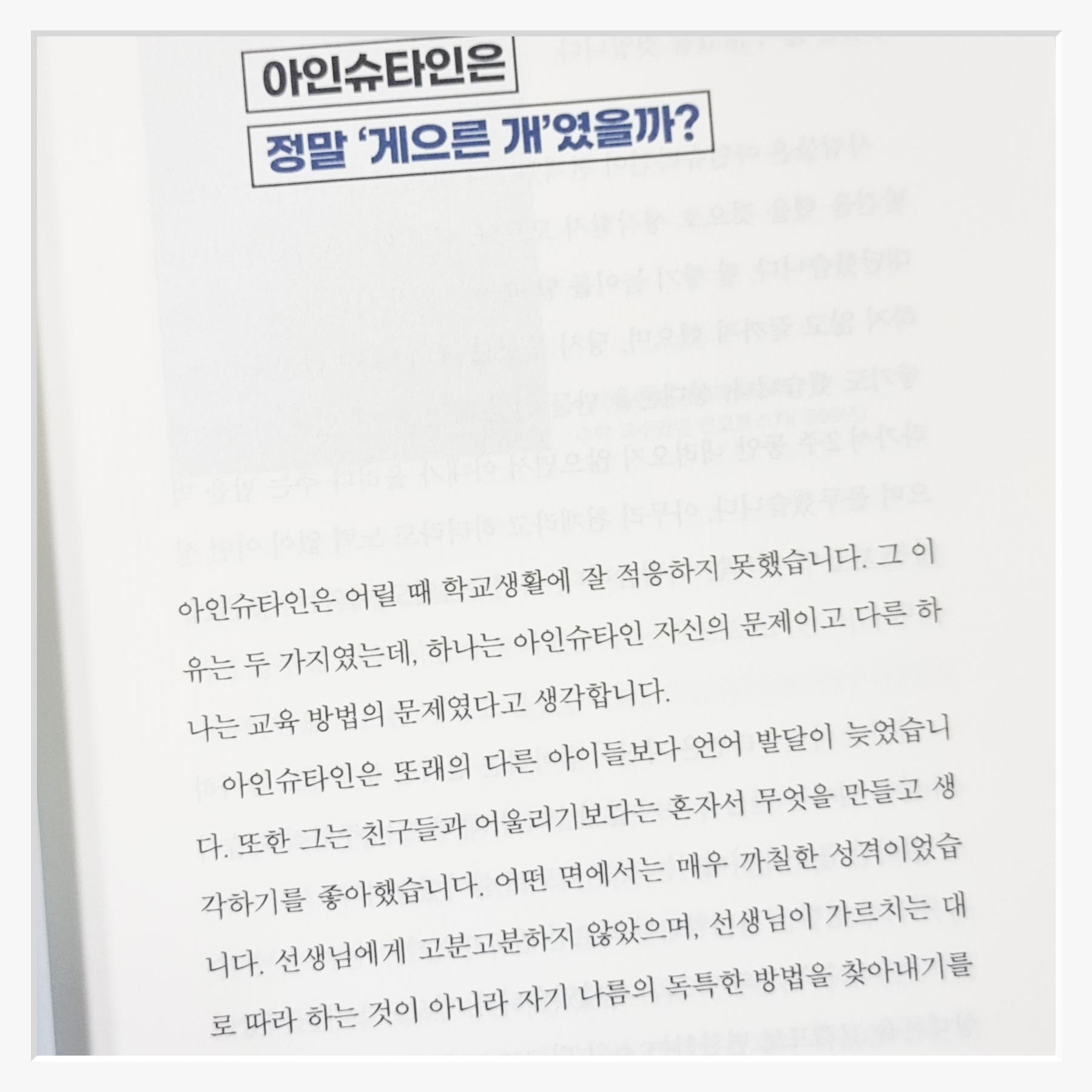 이 책은 아인슈타인의 삶과 업적을 재조명하며, 우리가 그에 대해 가지고 있던 편견을 하나하나 벗겨낸다. 아인슈타인은 단순히 타고난 천재가 아니었고, 끊임없는 노력과 실패 끝에 위대한 업적을 남긴 인물이었다. 이는 우리에게 큰 교훈을 준다. 진정한 성공은 노력 없이는 이루어질 수 없다는 점이다.
