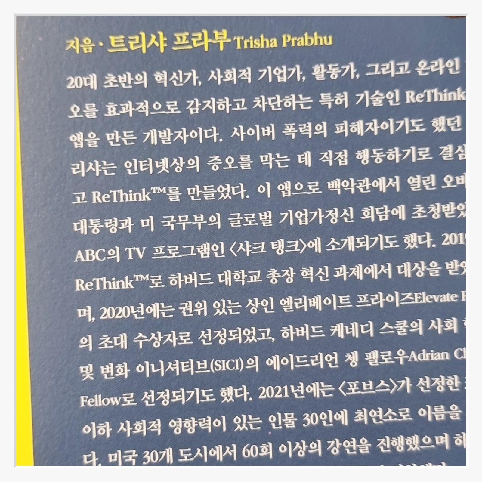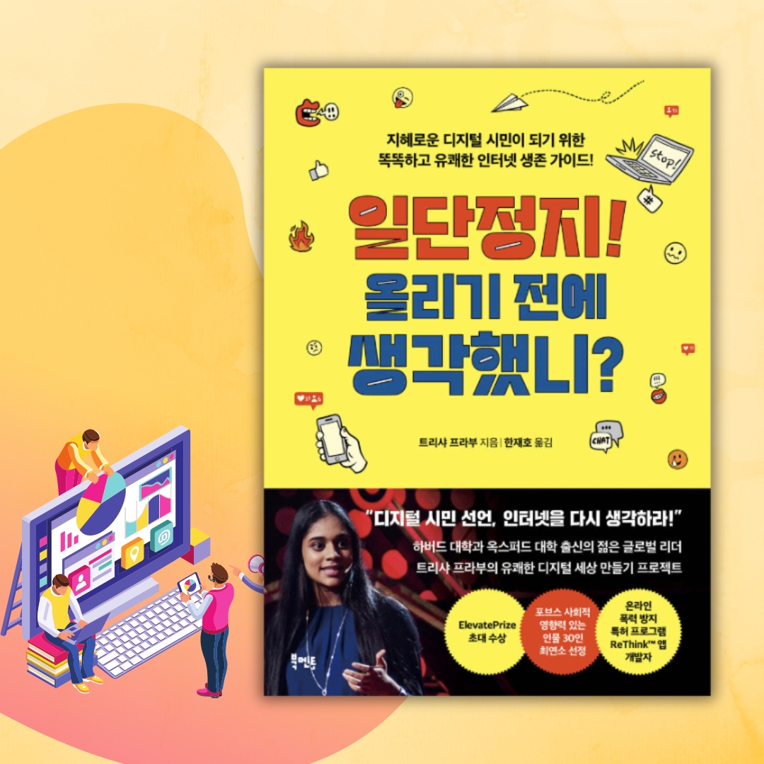 이런 문제를 고민하는 사람들에게는 트리샤 프라부의 『일단정지! 올리기 전에 생각했니?』가 좋은 길잡이가 될 수 있다. 트리샤는 자신이 청소년 시절 사이버 폭력의 피해자였기에 더욱 이 문제를 잘 이해하고, 이를 바탕으로 온라인 혐오를 방지하는 프로그램인 리싱크 앱을 만들었다. 이 책은 그녀가 겪은 경험을 통해 온라인 세상에서 현명하게 행동하는 방법을 이야기한다.