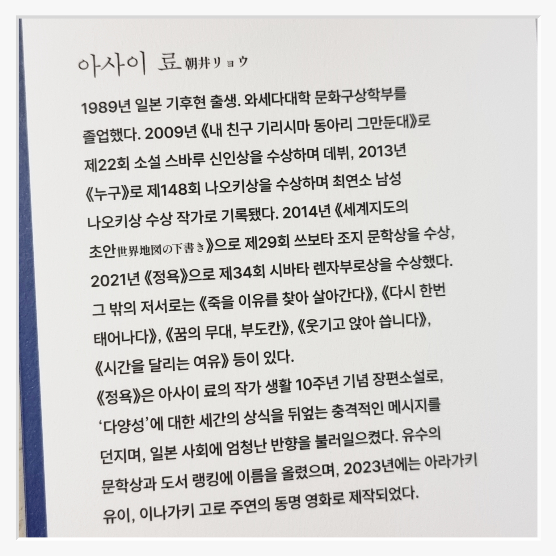 『정욕』을 펼치기 전, 나는 문득 우리 사회가 정말로 다양성을 수용하고 있는지, 그 범위는 어디까지인지 묻고 싶었다. 아사이 료의 이 소설은 그런 나의 의문에 대한 도발적인 초대장처럼 느껴졌다. 책을 읽으면서도, 마치 쉴 새 없이 쏟아지는 질문들에 내 생각을 정리할 겨를도 없이 페이지는 계속해서 넘어갔다.