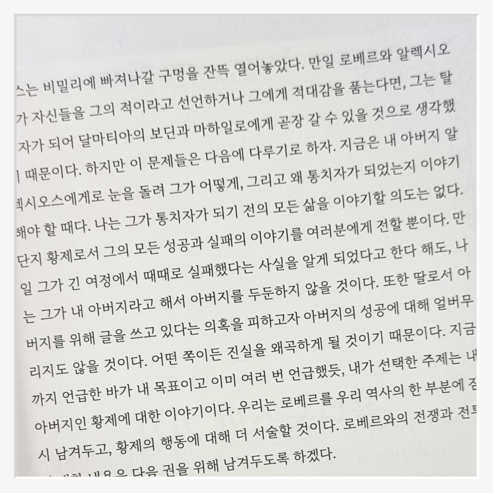 이 책을 읽으면서 놀란 점 중 하나는, 안나 콤니니가 그 시대의 여성으로서 얼마나 광범위한 지식을 가지고 있었는지다. 그녀는 단순히 역사를 기록하는 데 그치지 않고, 군사 전략, 경제, 정치, 심지어 문학적 가치에 이르기까지 자신의 폭넓은 이해를 바탕으로 아버지의 통치 시기를 상세히 분석했다. 그리고 이 모든 것을 통해 그녀는 당시 동로마 제국이 처한 복잡한 상황과, 그 안에서 아버지가 어떻게 위기를 극복하고 제국을 이끌어 갔는지를 보여준다.