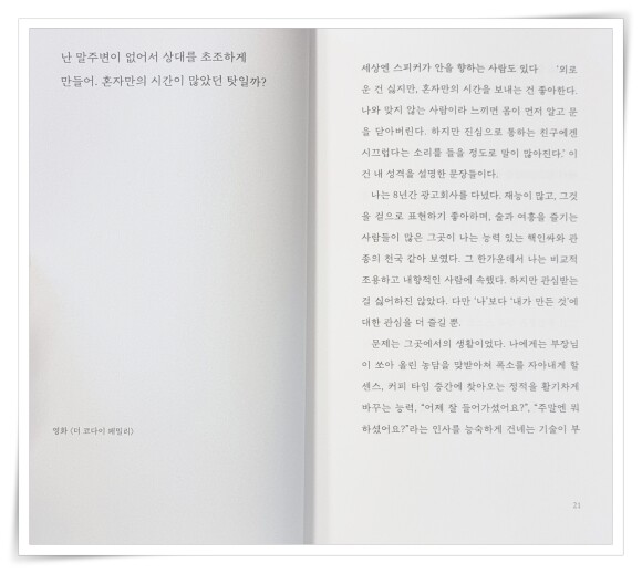이 책을 읽다 보면평범해 보이는 일상의 순간들이 얼마나 소중한지 깨닫게 된다페이지를 넘길 때마다 나에게 던져진 질문들은 스스로를 돌아보게 하고내면의 목소리에 귀 기울이게 만든다이 책의 가장 큰 매력은 바로 그 '자기 성찰'의 과정이다.