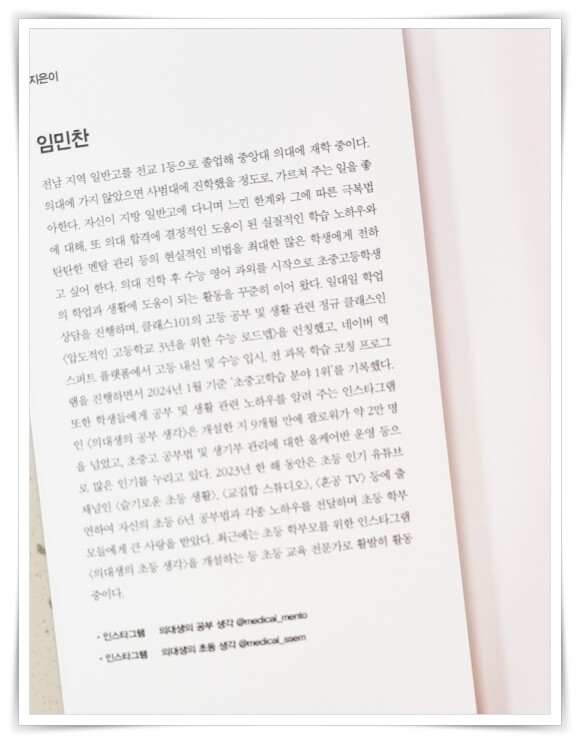 저자 임민찬은 전남 지역 일반고를 전교 1등으로 졸업하고 중앙대 의대에 재학 중인 의대생이다. 그의 조언은 실제 경험에서 우러나오는 것이라 더욱 믿음직하다. 특히, 이 책에서 저자가 강조하는 부분은 '공부 잘하는 아이로 키우기 위한 구체적인 방법'이 아니라, 아이가 공부에 대한 흥미를 잃지 않게 하는 것이다.