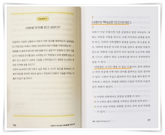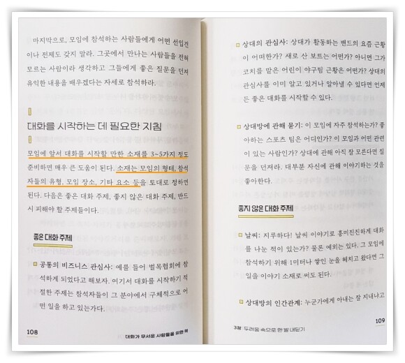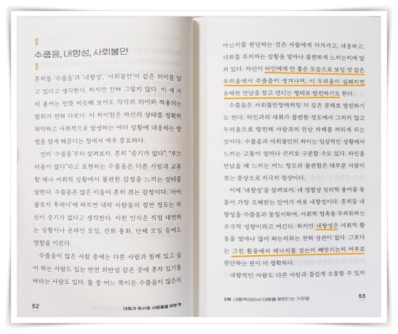 사실 나는 대화에 어려움을 느낄 때가 많다. 미팅이나 모임 등에서 상대를 만나면 무엇을 어떻게 말해야 할지 모르겠고, 내가 뭘 잘못 말하면 어떡하나 하는 걱정이 앞선다. 이러한 고민을 해결하기 위한 대화가 무서운 사람들을 위한 책은 대화에 겪는 이들을 위한 책이다.