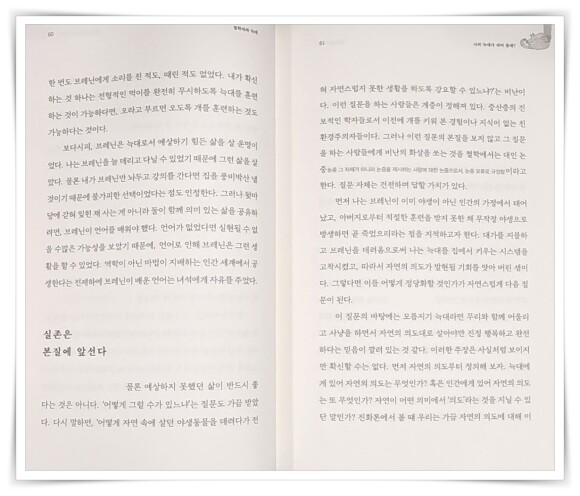 브레닌과 마크 롤랜즈의 이야기는 마치 오래된 친구와의 대화 같았다. 늑대와 철학자의 관계에서 인간과 자연의 균형을 찾는 방법을 배웠다. 특히, 늑대의 순수함과 철학자의 깊은 사유가 만나 이루어낸 통찰이 매력적이었다.