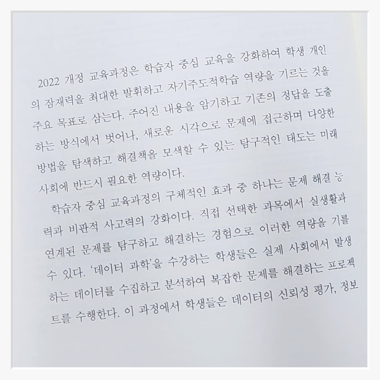 책의 핵심은 바로 '탐구력'이었다. 탐구력이라는 단어 자체가 생소하진 않다. 요즘 워낙 강조되고 있으니까. 그런데 문제는 도대체 탐구력을 어떻게 키우고, 그걸 생기부에 어떻게 녹여내야 하는지가 내겐 막막했던 거다. 솔직히 탐구력 하면, 괜히 뭔가 거창한 프로젝트라도 해야 할 것 같아 부담스럽기도 했고 말이다.