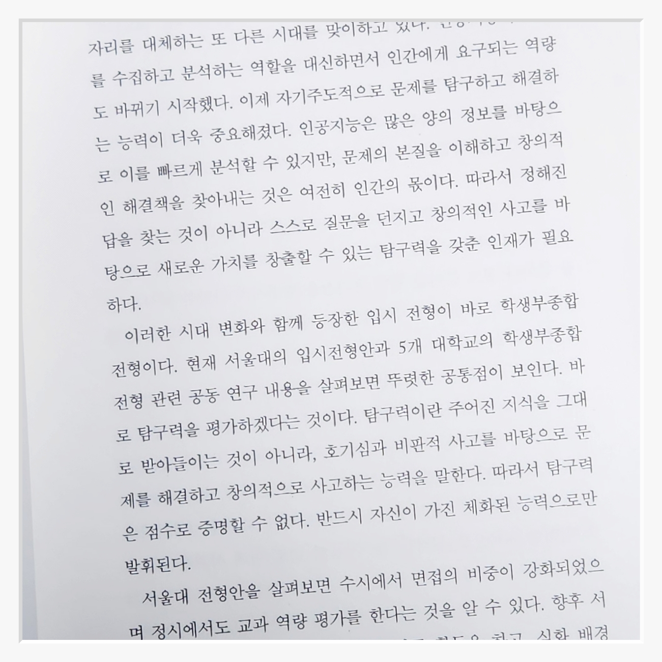 이제 입시는 더 이상 단순히 암기력을 겨루는 싸움이 아니라는 걸 명확히 알았다. 질문하고, 고민하고, 해결하는 능력. 탐구력은 결국 아이의 삶을 더 풍요롭게 만드는 필수적인 능력이며, 대학은 그걸 생기부를 통해 평가하려고 한다. 이 책을 통해 나와 같은 고민을 가진 부모들이나 학생들이 앞으로의 방향을 잡을 수 있을 거라는 생각이 든다.