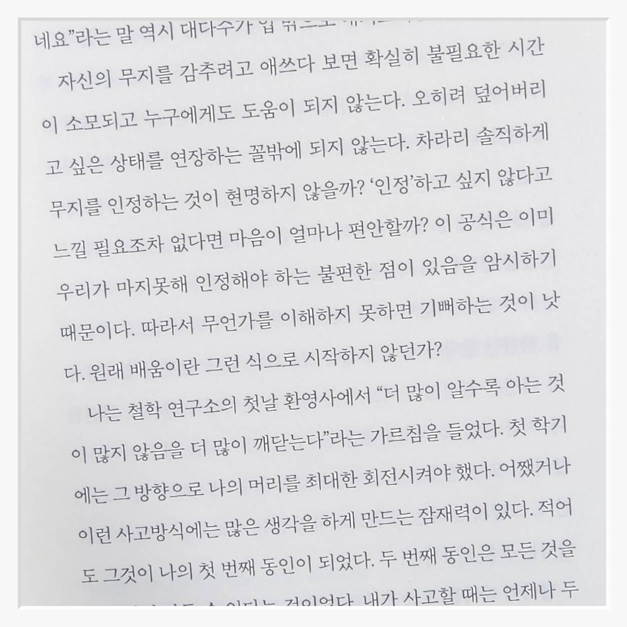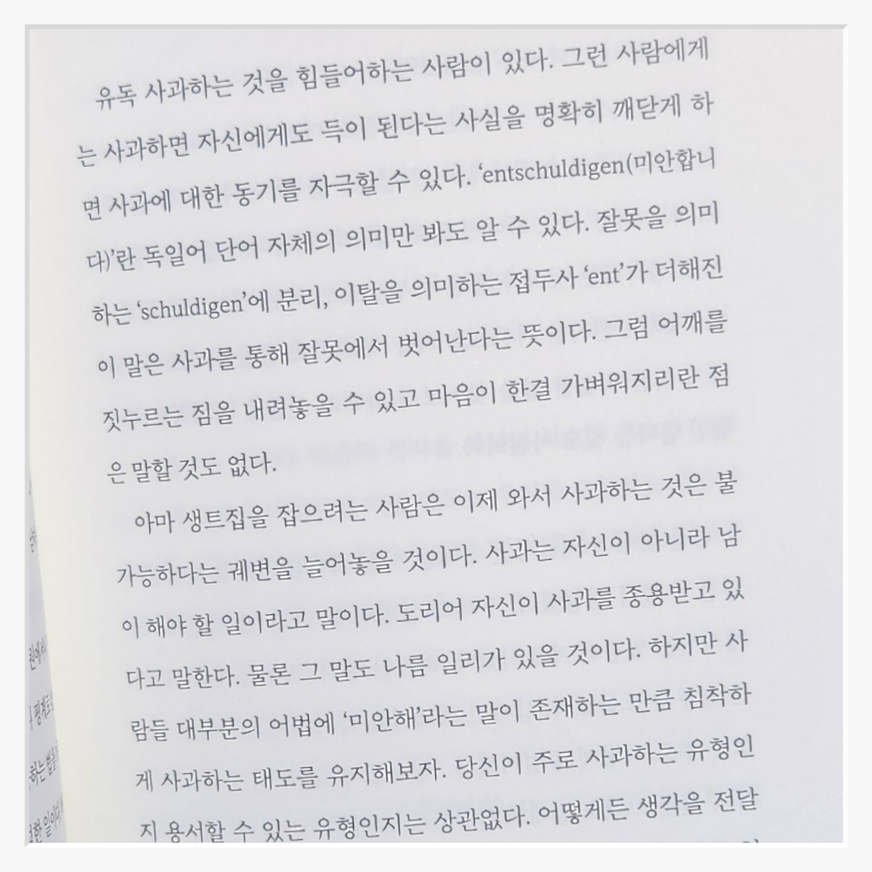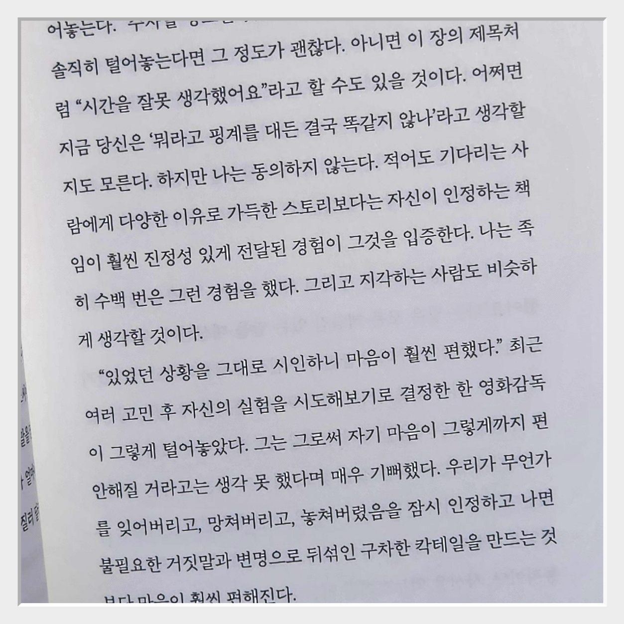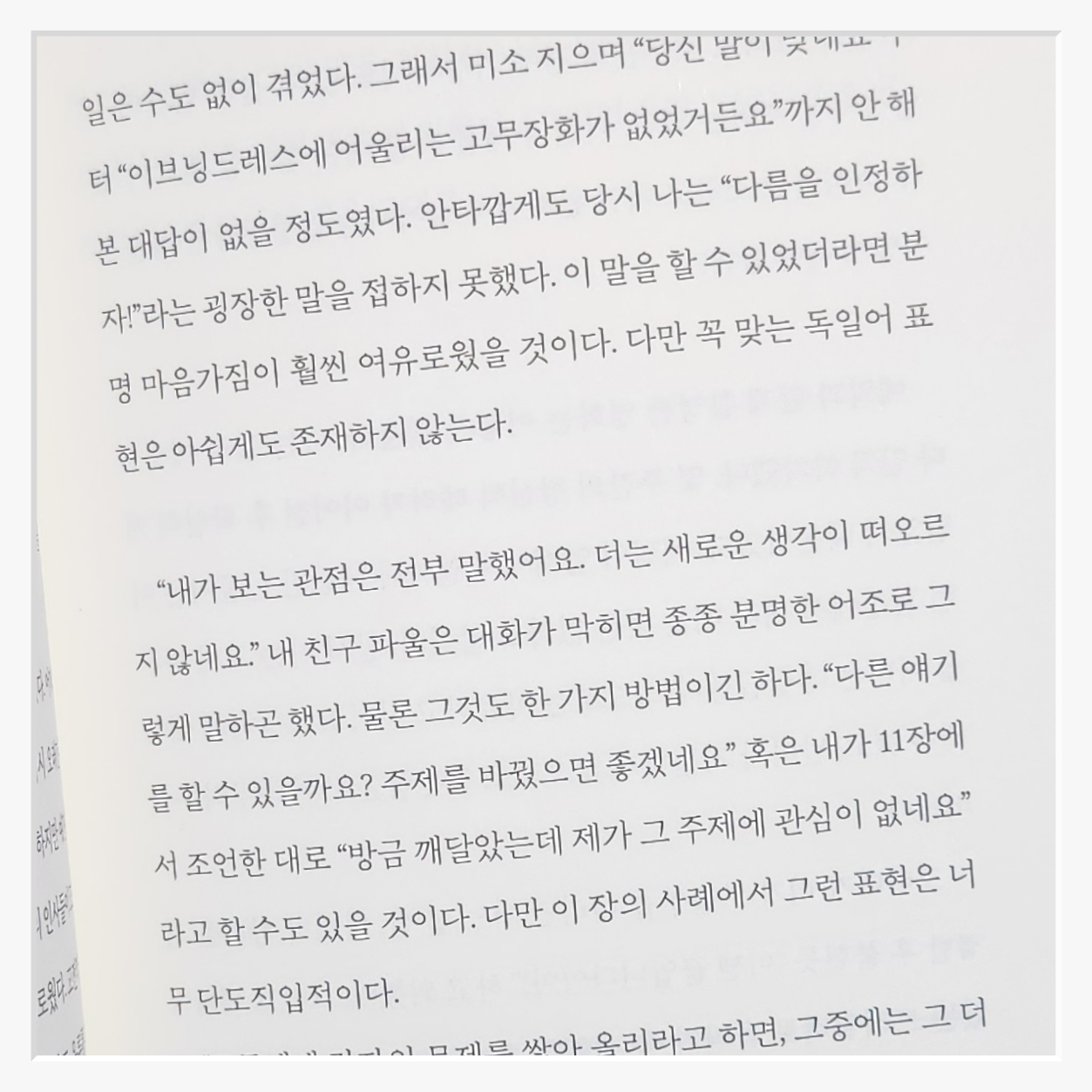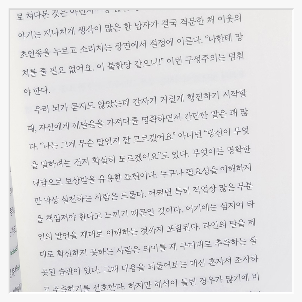 이 책을 읽기 전까지는 상대를 배려하며 말하는 것이 좋은 대화법이라고 생각했다하지만 읽고 나니 배려보다 더 중요한 게 주체성이라는 걸 깨달았다배려는 좋지만그것이 나를 희생하면서까지 이루어질 필요는 없다. "당신에게 맞서려는 게 아니라나를 위해 그러는 거야"라는 문장은 그 점을 명확히 보여준다.