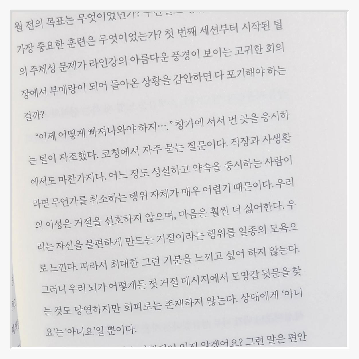 책에서 소개하는 표현들은 막연한 조언이 아니라일상에서 바로 사용할 수 있는 것들이다예를 들어 "지금은 혼자만의 시간이 필요해"라는 문장을 연습하면거절하는 것이 어렵지 않다는 걸 깨닫게 된다. "모르겠어요"라는 단순한 말도 사실은 강력한 거절의 의미를 담고 있다이런 표현들을 평소 연습해 두면막상 필요한 순간에 당황하지 않고 말할 수 있다.