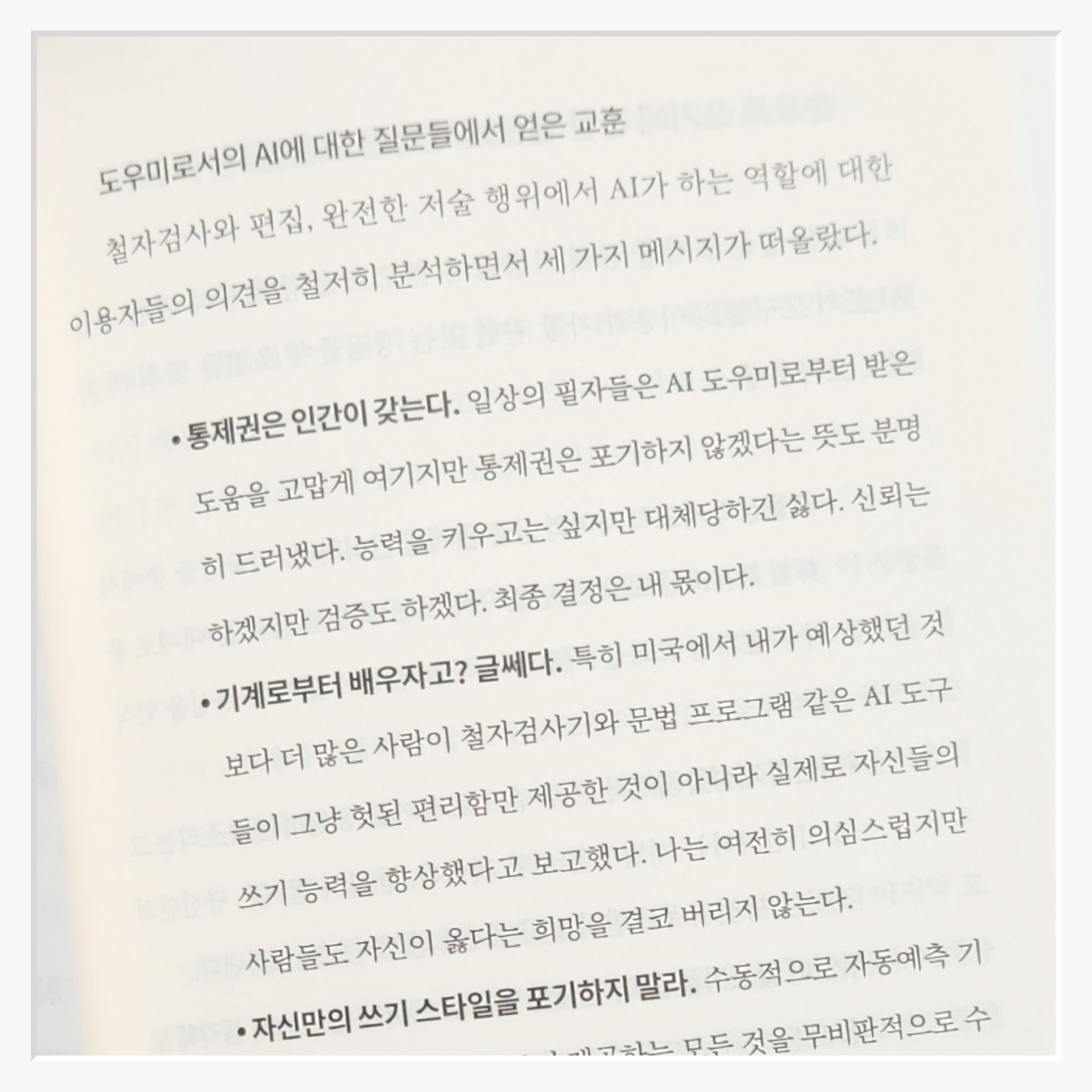 그렇다고 AI가 모두 나쁜 것은 아니다책은 AI와의 협력 가능성에 대해 이야기한다예를 들어, AI는 이메일 초안을 잡아주거나 문법 검사를 돕는 훌륭한 도구가 될 수 있다저자는 우리가 AI와 함께 새로운 글쓰기 환경을 만들어갈 수 있다고 제안한다중요한 것은인간만의 창의성과 사고 능력을 어디까지 보존하고 활용할지를 스스로 결정해야 한다는 점이다.