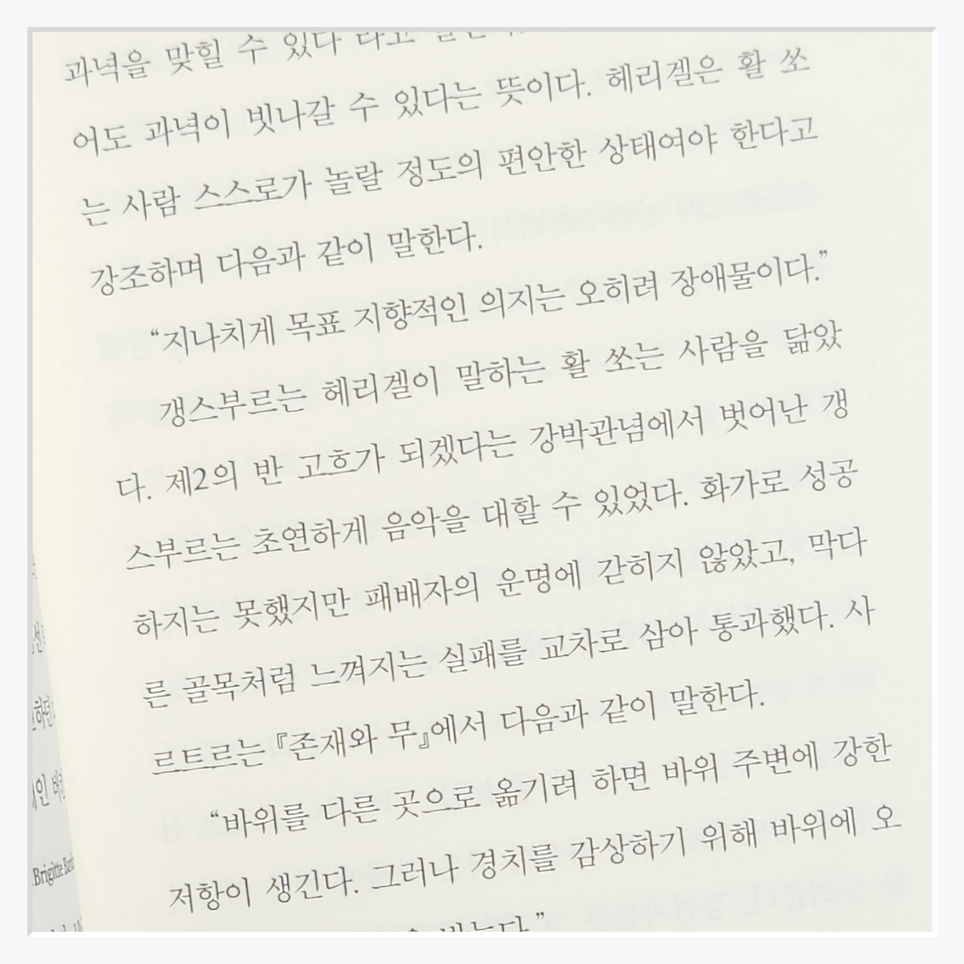 태도의 철학은 실패를 다루는 철학 에세이지만무겁지 않다철학적 통찰은 물론현실적인 예시와 실천 가능한 메시지가 가득하다학생부터 직장인까지 모두가 공감할 수 있는 이야기가 펼쳐진다특히 '바위를 옮기려 하지 말고 그 위에 올라서라'는 사르트르의 말은 나에게도 큰 울림을 주었다.