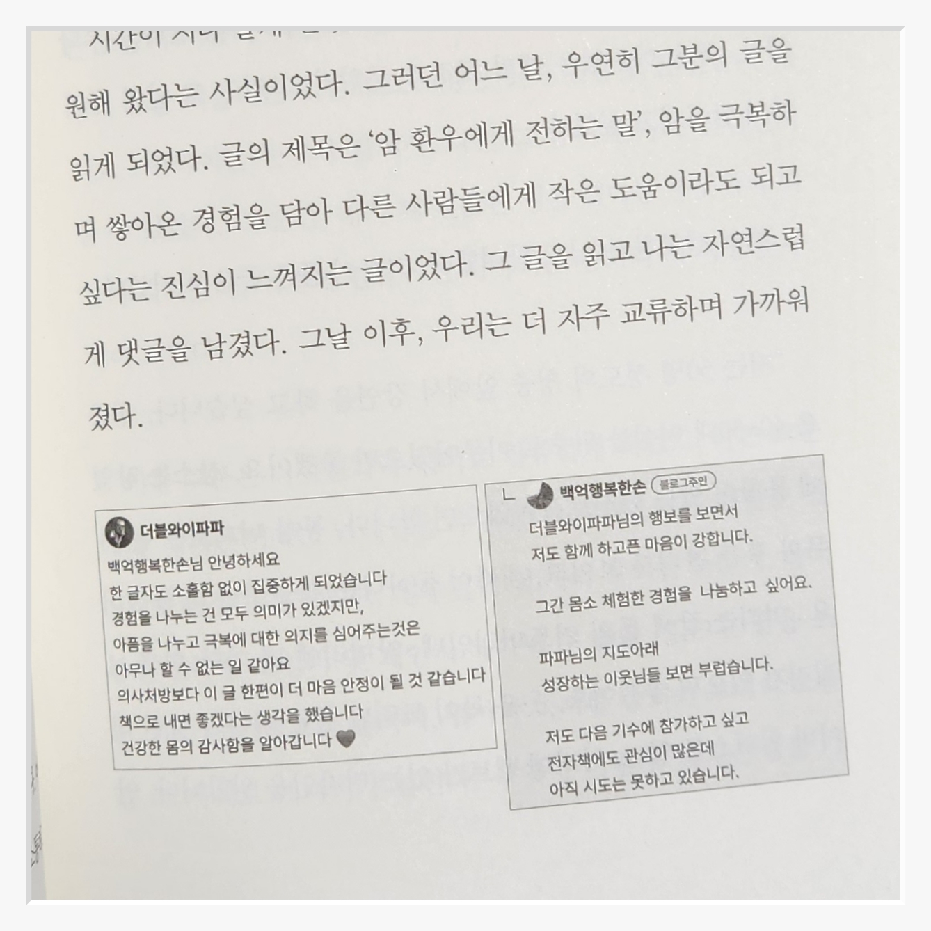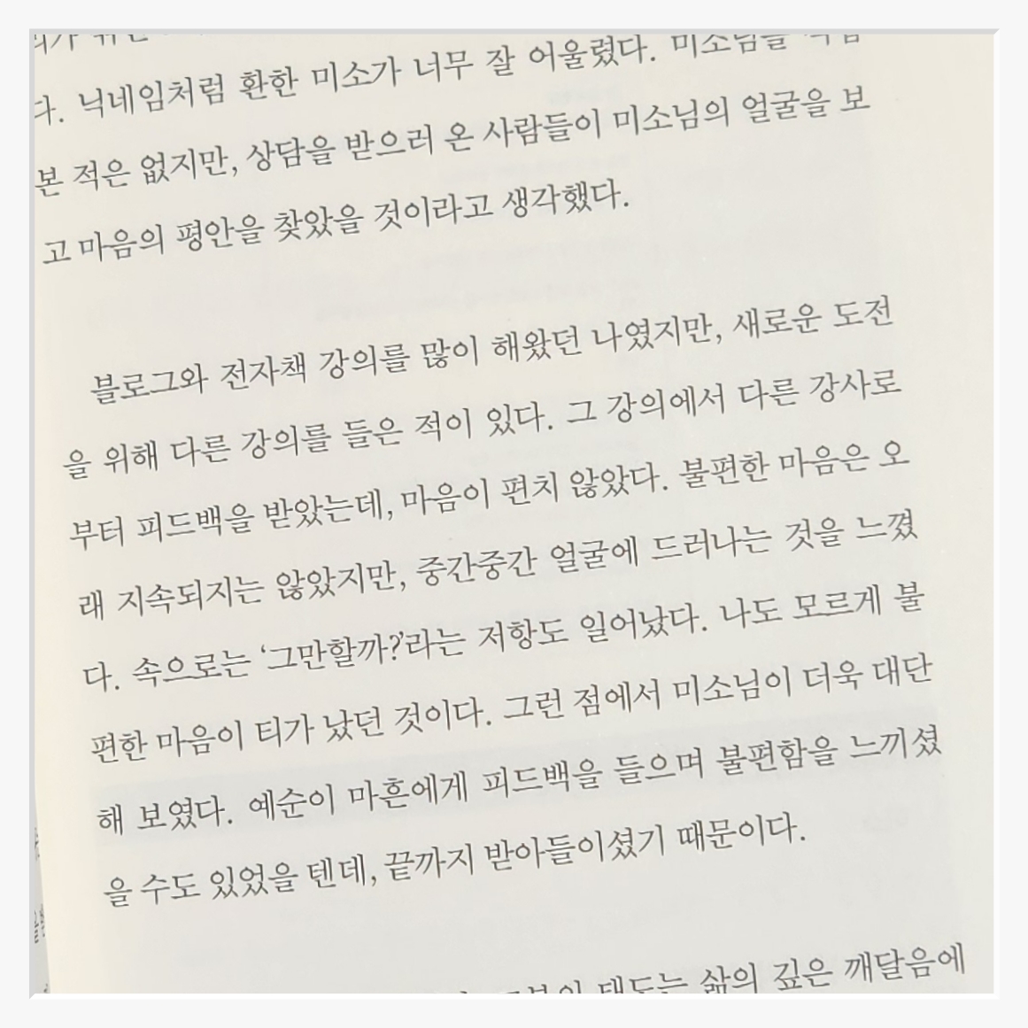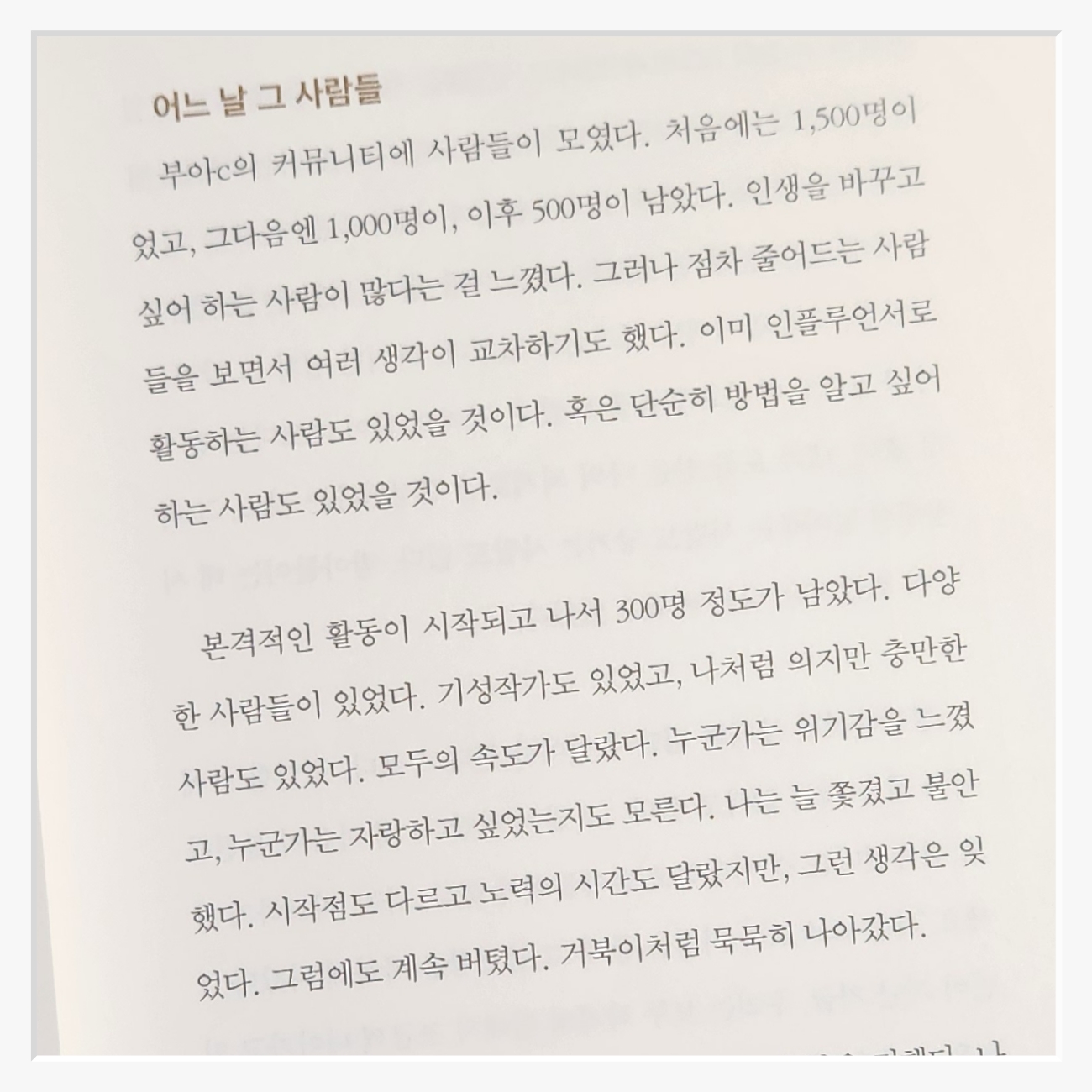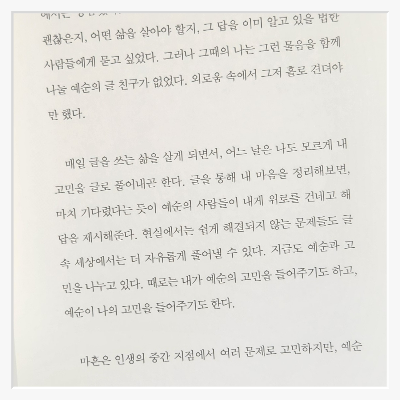 책의 문장은 꾸밈없이 담백하다특히 저자가 자신의 불행과 고통을 솔직히 고백하는 부분은 인상 깊었다누구도 완벽한 삶을 살지 못한다는 사실우리가 때로는 넘어지고 실수하면서도 여전히 살아가고 있다는 사실이 묘한 안도감을 준다나 역시 문득 과거를 돌아보며 그 시절의 나에게 "정말 잘 버텼어"라고 말하고 싶어졌다.
