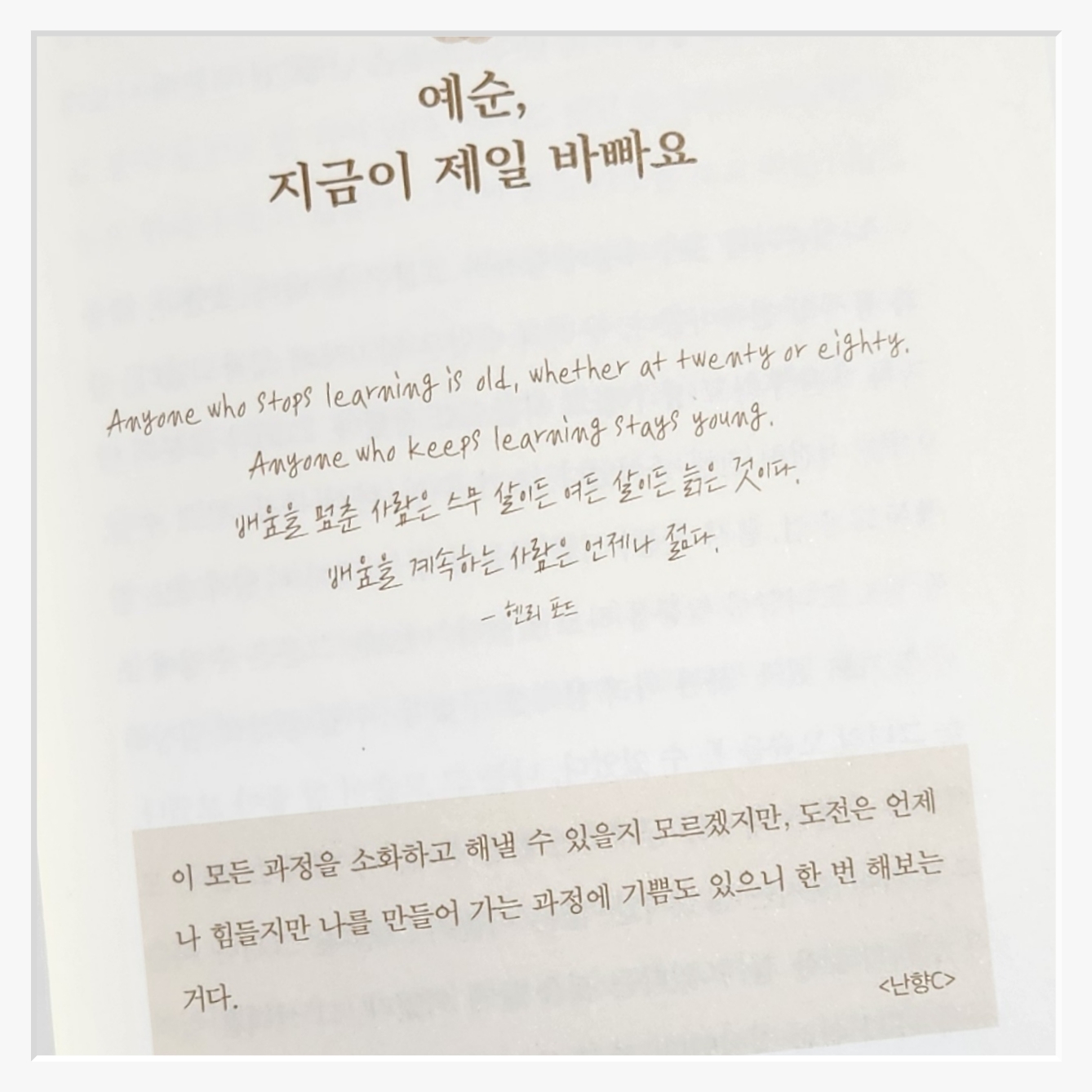 버텨온 시간은 전부 내 힘이었다는 삶을 다시 바라보게 만든다어제보다 조금 더 단단해진 오늘의 나를 발견하게 하고다가올 시련마저도 받아들일 힘을 준다. "머지않아 걱정은 사라지고나는 이 땅에 행복하기 위해 태어났다." 이 문장을 곱씹으며오늘도 나만의 속도로 걸어가고 싶다.