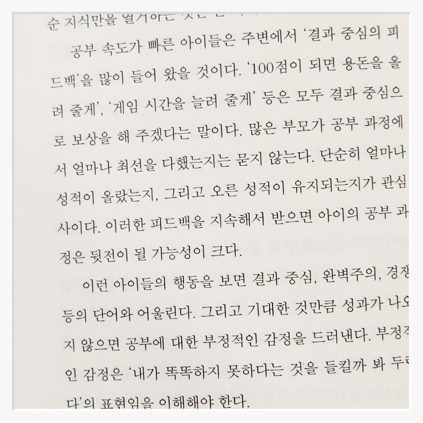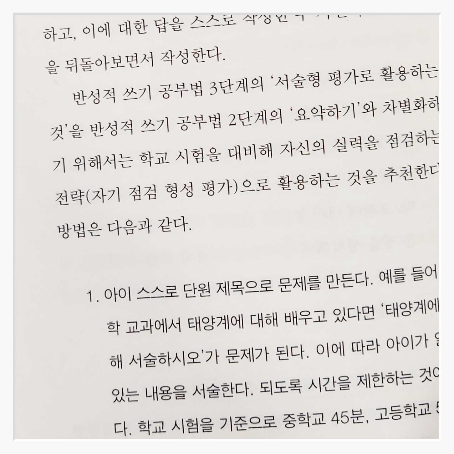 책은 반성적 쓰기를 통해 아이의 성장 과정을 기록하는 기쁨도 알려준다. 공부를 하며 적어둔 기록들은 그 자체로 아이가 성장했음을 보여주는 작은 성과물이다. 마치 사진첩을 보는 것처럼, 쓰기 노트를 펼치면 아이가 고민하고 노력했던 흔적이 고스란히 담겨 있다. 이는 단순히 성적 상승만을 위한 공부법이 아니라, 아이의 삶 전반을 풍요롭게 만드는 방법이다.