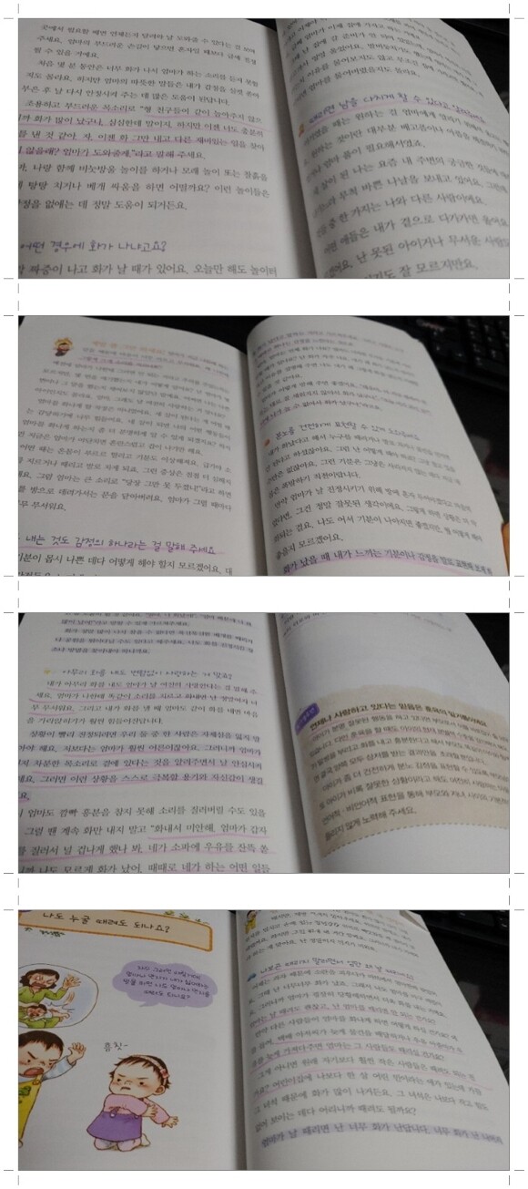 그림 하나하나가 내용에 대한 이야기에요. 그래서 펼쳐놓고 사진을 찍었어요. 우리 아이들이 이럴 때 화나고 왜 이런 지 알 수 없다 하는 경우를 모아놓은 듯한 그림이에요. 아이가 왜 이러는 걸까요? 우리 한번 책으로 들어가 봐요.
