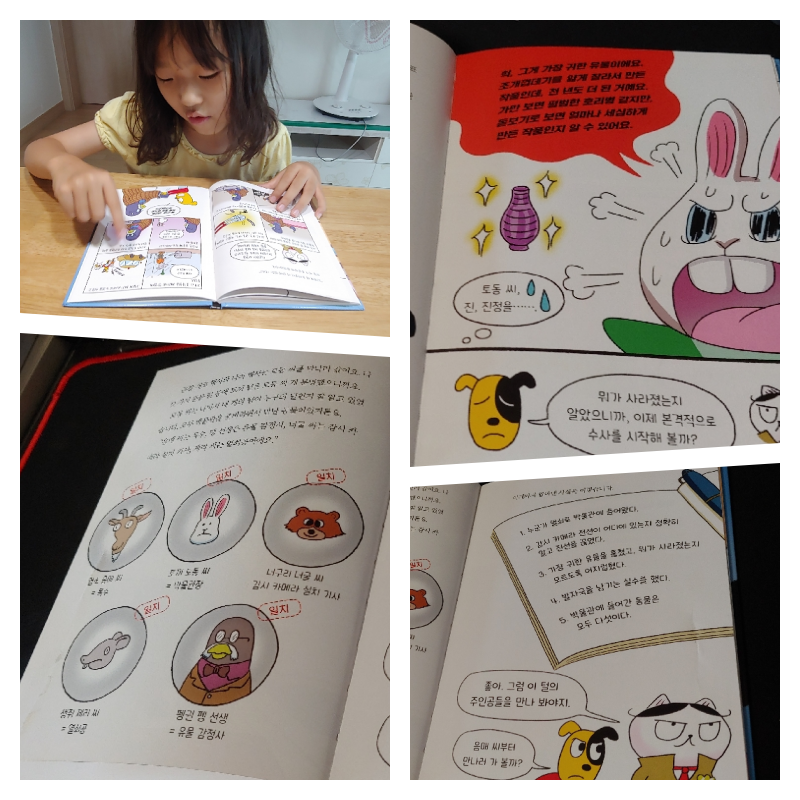 재미있는 스토리를 따라가면서 단서찾기, 증거수집하기,증거분석하기, 탐문수사, 용의자 알리바이 증명하기, 범인 지목하기, 범인 추격하기 등의 탐정수사에 대한 기초적인 것을 배울수있었어요.