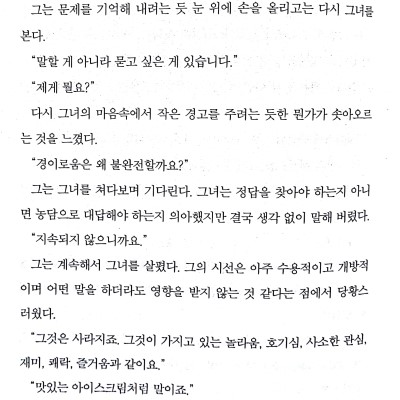 닉과 밀레나의 시점에서 번갈아 전개 되는데, 정전에서부터 대 환장 파티까지 3일밖에 지나지 않았다는 사실을 상기할 때마다 흠칫 놀라게 된다. 너무 많은 일들을 본 것 같은데, 고작 3일이라니. 인물들의 내면묘사에 공감하며 가다보면 뜻밖의 대 환장 파티를 만나게 된다. 예상외의 장면에 당황스러움을 느끼기가 무섭게 곧 통쾌함을 느끼게 된다. 묵어놓은 감정들이 폭발하는 장면은 언제나 통쾌하지만 인간관계에 대한 심리가 많은 책이라 더 통쾌하게 느껴졌다. 젤라토를 소재로 전개된 뜻밖의 매력적인 이야기에 안드레아 데 카를로의 다른 소설이 궁금해진다.