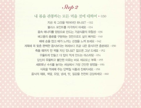 책의 목차는 Step10 까지 있으며 차근차근 읽어가다보면 그동안 내가 내 몸을 어떻게 사랑했는지 혹은 어떻게 학대했는지를 느낄수가 있다. 정신적으로 육체적으로 건강해질 수 있는 책이다. 앞으로 내가 먹는 것들이 내 몸에 약이 될지 독이 될지를 다시 한번 생각하게 될 것 같다.