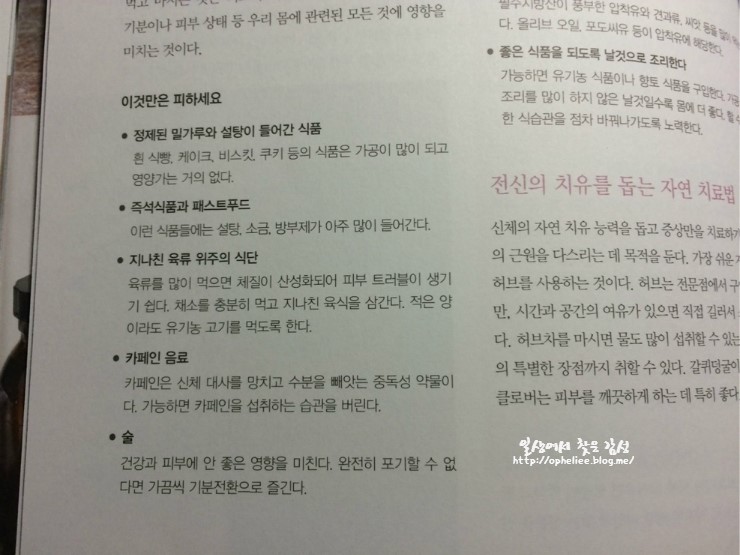 우선, 남편이 늘 강조하는 것 중의 하나가, 음식물 섭취의 중요성인데, 이 책에도 피부에 기본적으로 좋지 않은 식품군이 다양하게 소개되어 있다.
