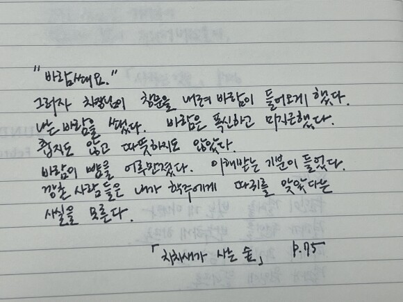 🔖 여러분과 이 글을 함께 나누고 싶다는 생각이 든 건 글 말미가 이쯤이다 싶어서일 텐데 이제나저제나 언제나 우리는 우리에게 닥친 어떤 끝의 순간에 그 끝이라는 단어를 보무도 당당히 적을 수 있게 될지 모르겠습니다.