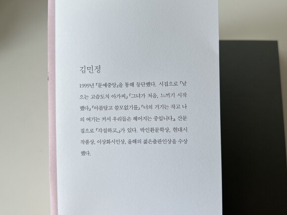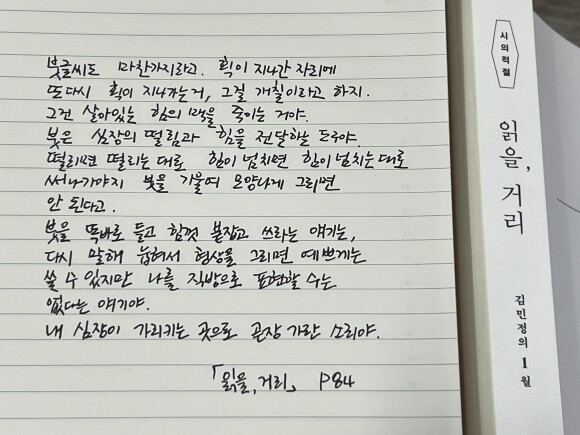 1월 겨울에 읽음이 적절하다고 생각했는데, 계절상 외부나 동적인 활동보다는 사유하거나 감성적으로 조용하게 누군가의 그리움과 그들의 이야기를 들을 수 있는 내용이 많아서인 듯했다. 매일의 다른 종류의 글 모음이라 계간지를 같기도, 김민정 시인이 기억하고 싶고, 좋아하는 글을 담은 일기장 같기도.
