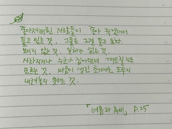 박연준 시인의 첫 장편소설이다. 중간 중간 시를 읽는 듯 은유들이 나오는 데 여름이와 루비의 서사와 어우러져 어리기만하고 유치할 수도 있었던 유년 시절을 큰 시절로 만들어준 것 같다. 숨어있는 시적 표현들에 대해 완벽히 이해하지 못했다. 그 시절, 그 때만 알 수 있는 감정이 있을텐데 아마도 내가 기억하지 못하는 어쩌면 잊었을 수도 있을 그 시절의 감정을 나는 아직 찾지 못했기에 이해를 못하는 것은 아닐까.
