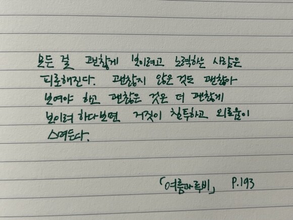 모든 걸 괜찮게 보이려고 노력하는 사람은 피로해진다. 괜찮지 않은 것도 괜찮아 보여야 하고 괜찮은 것은 더 괜찮게 보이려 하다 보면 거짓이 침투하고 외로움이 스며든다. P193