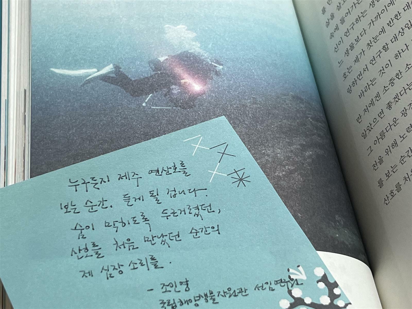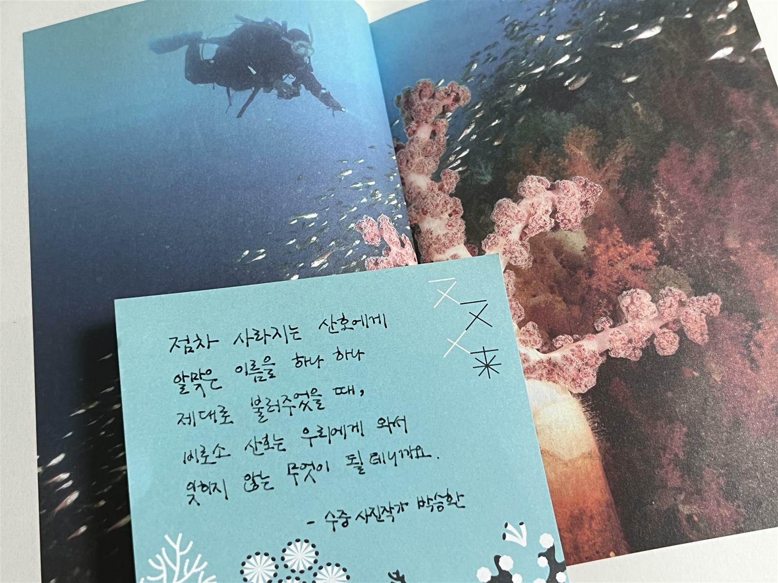 누구든지 제주 연산호를 보는 순간, 듣게 될 겁니다. 숨이 막히도록 두근거렸던, 산호를 처음 만났던 순간의 제 심장 소리를.