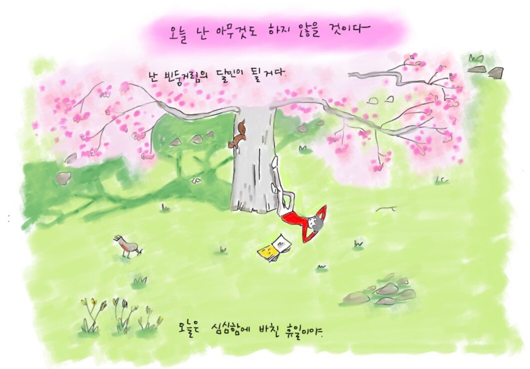 애완동물처럼 돌보아 주어야하는 존재로 바라보는 것이 아니라, 내가 쉼에 있어 나 자신에게 집중만 한다면 외부의 환경은 오히려 나에게 쉼을 선물해 준다는 의미를 주는 것이니까요. 그림을 보면 나도 꼭 저렇게 쉬고 싶다는 생각이 들었어요.❤️
