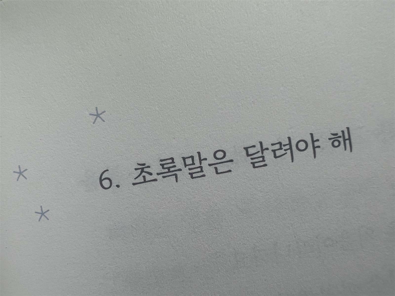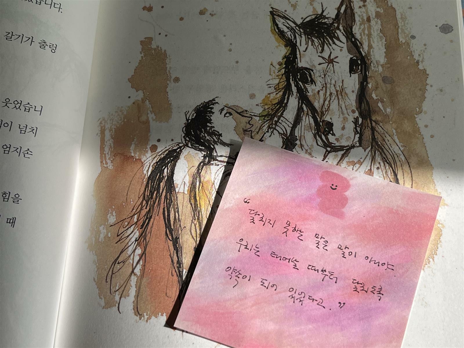 ‘햇볕이 눈부신 날이었어. 우연히 말 한 마리를 보았어. 나는 내 눈을 자꾸만 비볐어. 믿을 수 없겠지만 글쎄 초록말이었어. 짙은 암갈색 털에 햇살이 스며들어 초록빛이었어. 이제부터 너는 초록말이야. 나의 희망이야.’  P44
