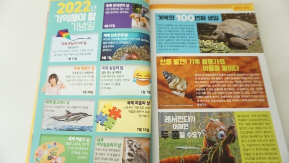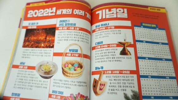 2022년 세계 여러가지 기념일,세계 8곳의 새해맞이 풍경 / 세계의 놀라운 10가지 교통수단/ 세계각국의 동전과 지폐 / 사라질 위기에 처한 언어를 살리자! 등 실려져 있는데요. 참 제목들 보면 바로 넘길 수없을만큼!