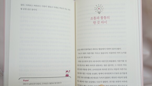 저자 첫째아이가 " 교실갔는데 제 자리 못 찾으면 어떻게해요?" 라는 질문에 채근이나 꾸지람보다 마음의 격려를 먼저 챙겼다고해요.