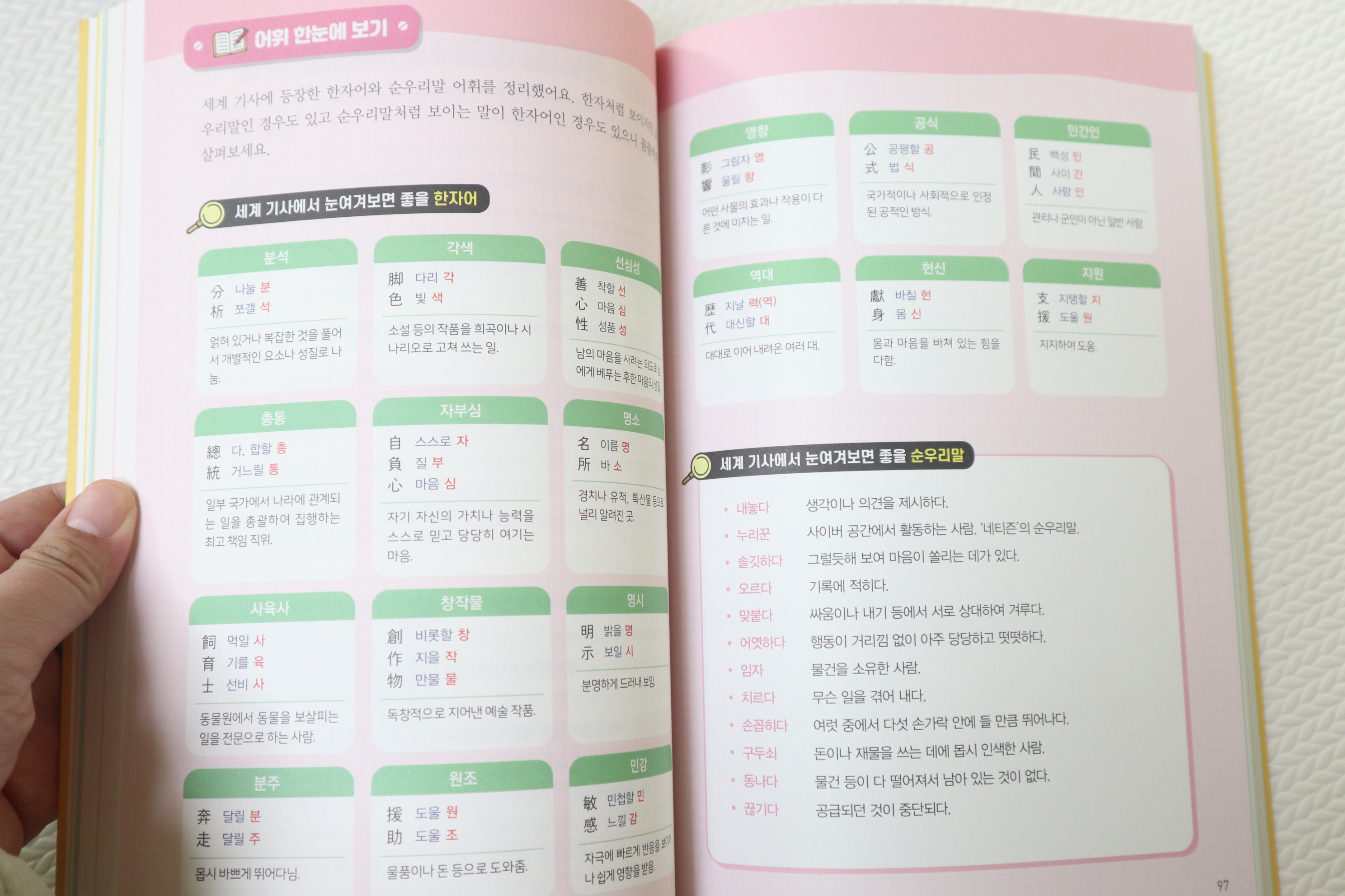 뿐만 아니라 기사를 읽고나서 등장한 어휘들을 한눈에 보면서 한자와 뜻풀이가 나와있어요.