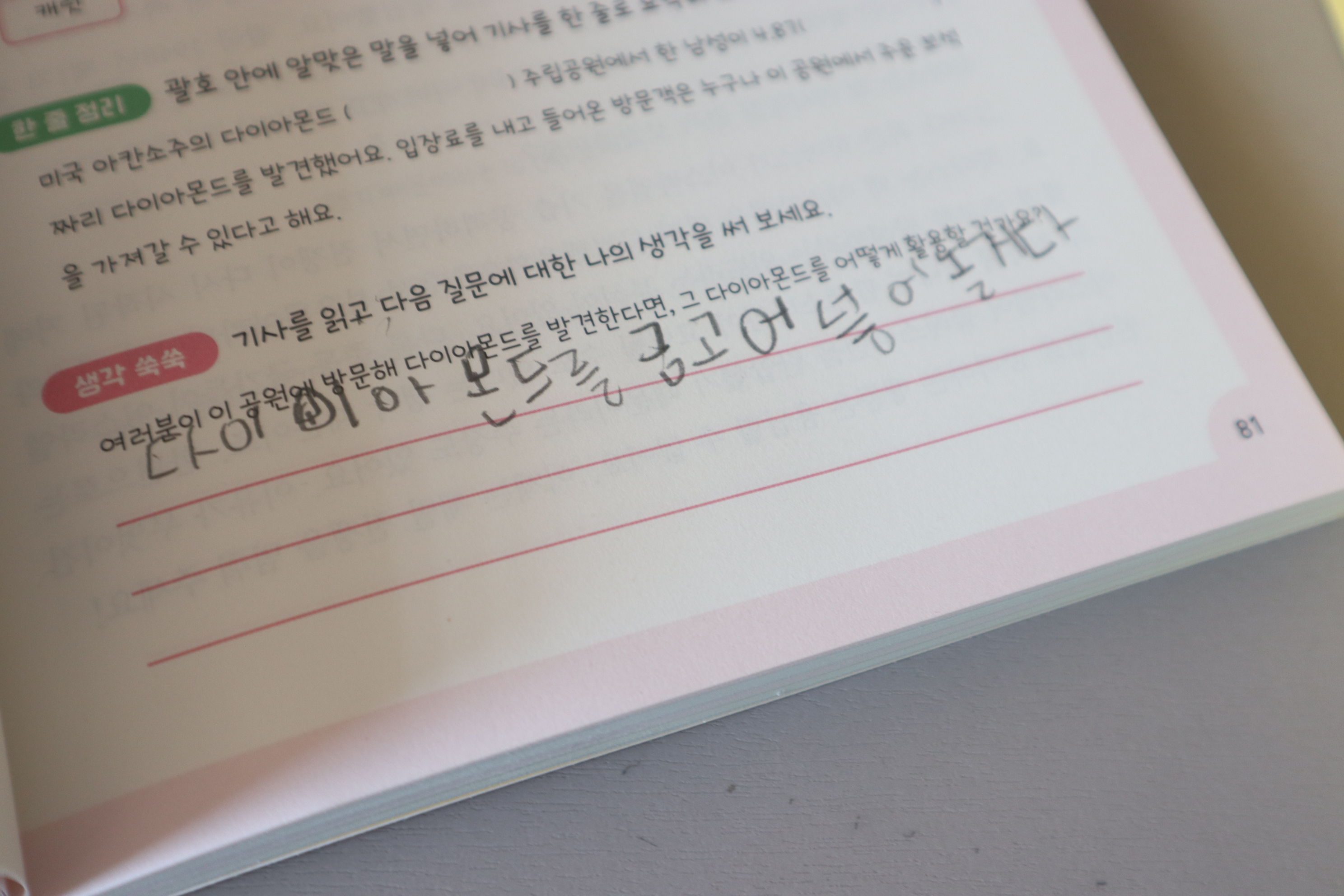 하루 한 장 ! 아침에 학교가기 전에 풀어보기 딱 적당해요. 하루 10 -15분 정도 되기도하고, 아이가 글쓰기 힘들어할 때에는 말로 하라도 할 때도 있어요.