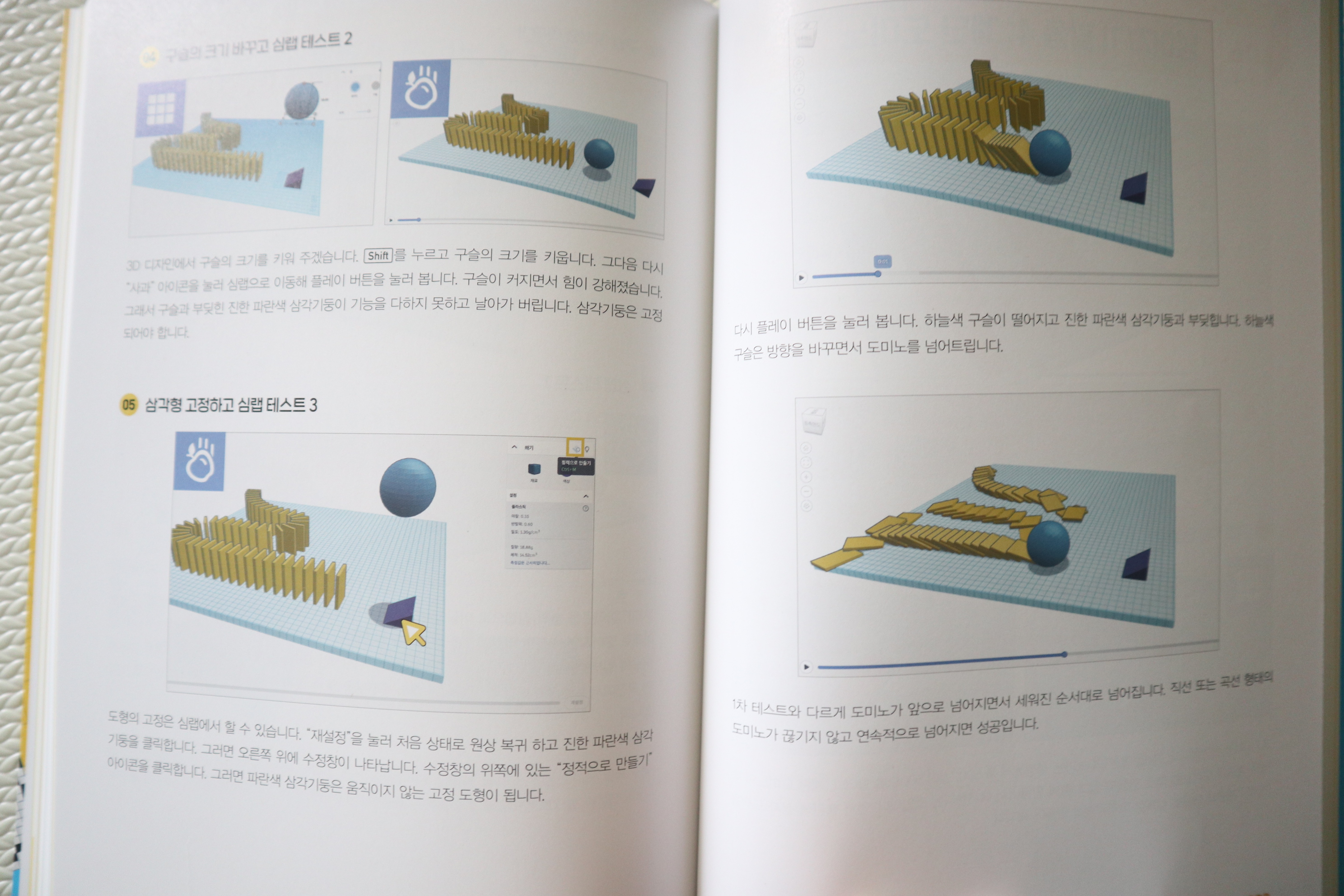 그래서 도미노, 롤러코스터, 구슬길, 이항분포 실험기, 지레의 원리 ,발사체 등 3d 모델링으로 만들어 실험할 수 있어요