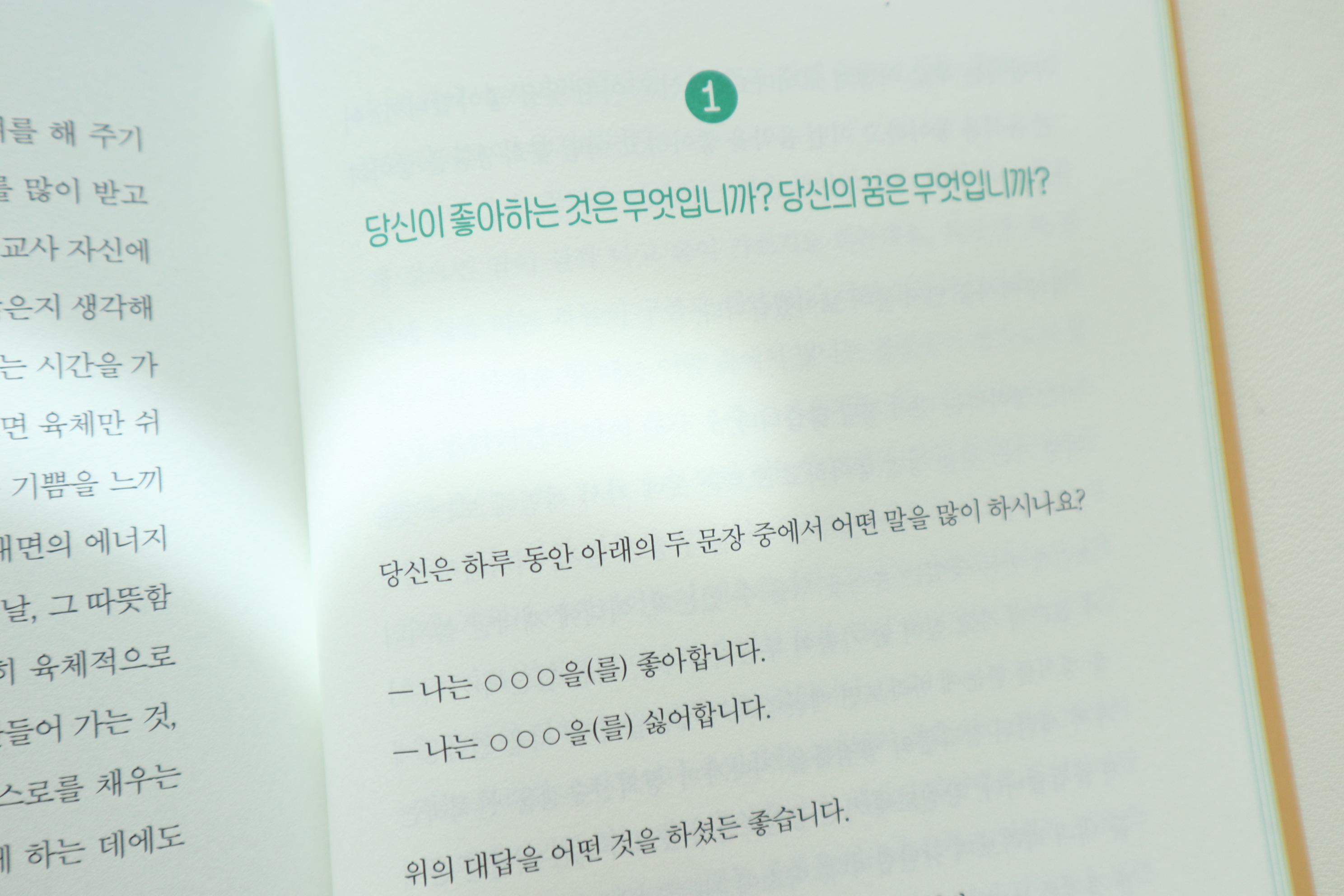저자는 우연히 '마음근육강화 100일 프로젝트' 유튜브 영상을 매일 10분씩 따라하면서 거대한 바위같이 짓누르던 직장과 학생들이 편안하게 느껴지기 시작했다고 ! 학생들 관계도 부드러워지고, 수업에 대한 열정, 마음도 편안해져 즐거움이 커지기 시작되었다고 한다.