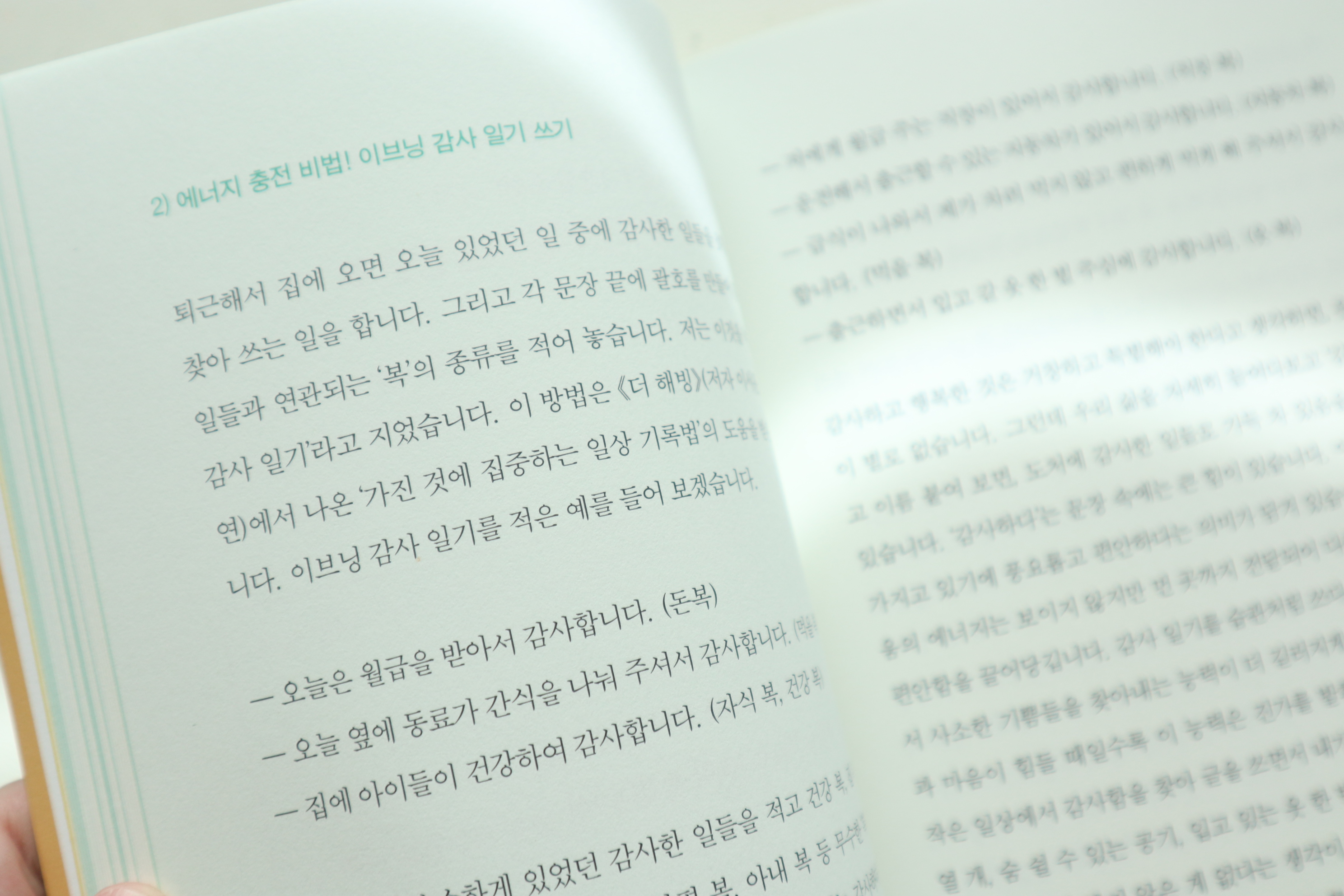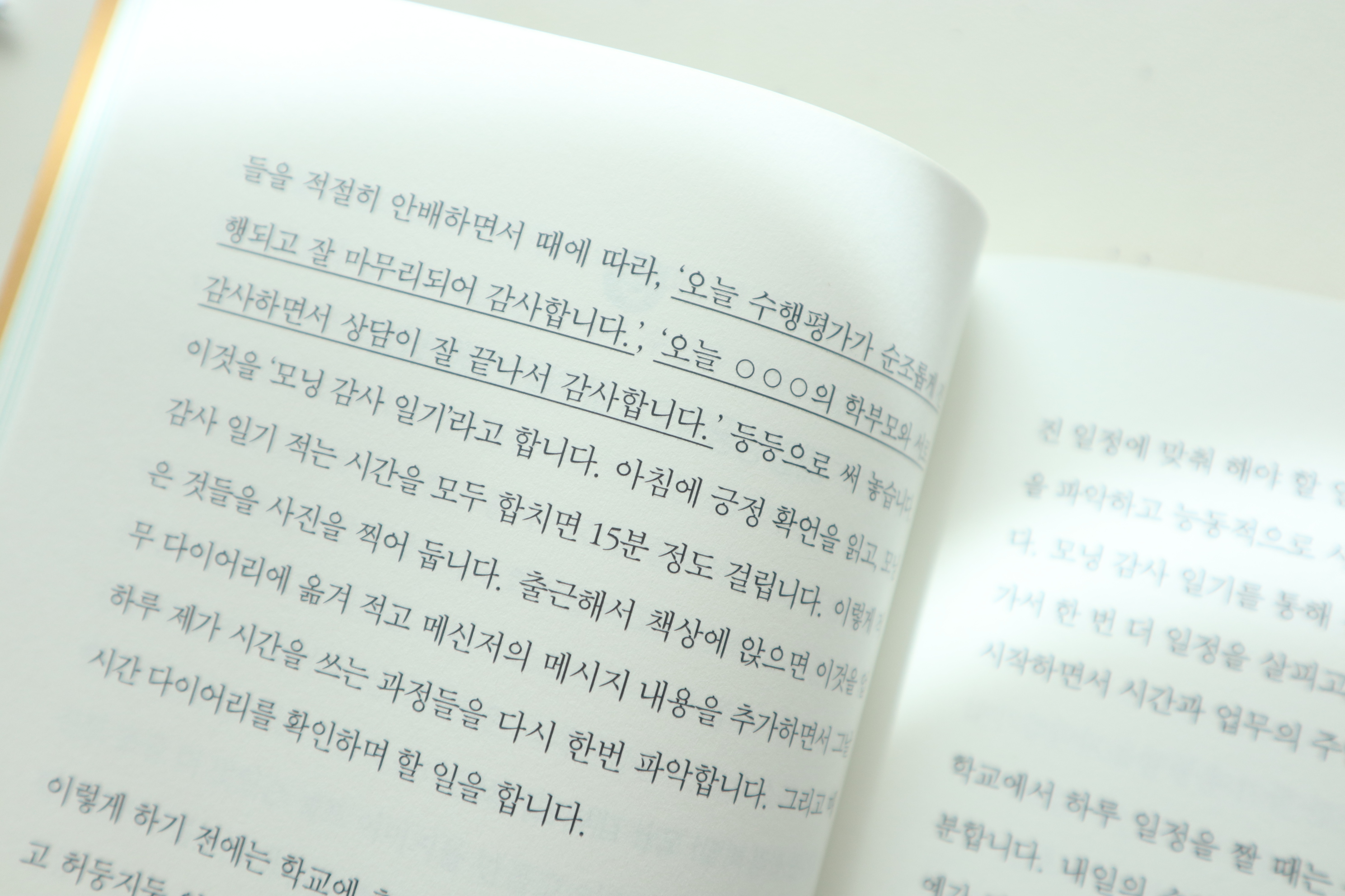 마음의 80%가 풍요와 감사로 채워지면, 나머지 20%의 전문직이고 기술적인 교육방법들은 200%효과를 발휘하게 된다고 한다. 이처럼  저자의 공감되는 좌충우돌 이야기를 읽어보며  나만 그런게 아니구나! 라는 위로도 받고, 마음근육 경험담과 방법들을 잘 익혀서 실천해보았다니 기대가 매우 커졌다.