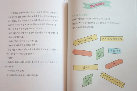 한솔수북 < 세젤잼 과학동화> 코딩대모험~ 너무 개념을 풀어쓰기보다는 스토리에 잘 녹여져 있고 챕터가 끝나면 해당 개념 설명 및 문제를 통해서 아웃풋 해보는 활동도 있어서 좋았어요.