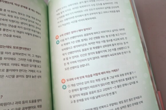 먼저 '매일 3시간씩 수학문제 풀기'가 있더라고요 수업듣기만 한다고 성적이 오르지 않는다고! 즉 스스로 문제를 풀고 고민하는 과정을 거쳐야 한다는 건데요. 단기간에 오르기 힘들기 때문에 수학 개념을 이해하고 유형을 익히는 건시간이 정말 정말 필요해요. 모르는 문제 나왔을 때에는 풀이과정을 3분 내외로 차분히 고민한 다음 답지를 펼쳐 해설을 ㅇ릭어요. 그리고 다시 문제로 돌아와서 해설을 떠올리면서 혼자 힘으로 문제를 다시 풀어요.