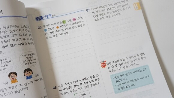 다만 문제 유형이 2-3번씩 생각해야하니까 힘들어하긴하는데 이런 것도 익숙해져야 고학년가서도 끝까지 푸는 힘이 길러진다고 해요. 그래서 사고력수학 문제를 저학년때 많이 풀라고 하는데요.