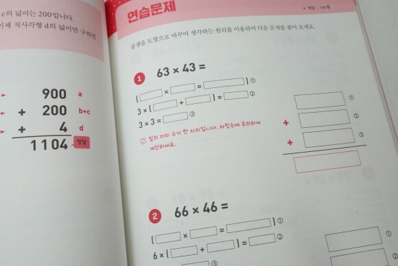 앞서 인도식 계산 방법을 옆에는 '구체적'으로 어떻게 풀면되는지 친절하게 설명 되어있고 하단에는 인도식 수학방법을 풀어보며 익혀요.